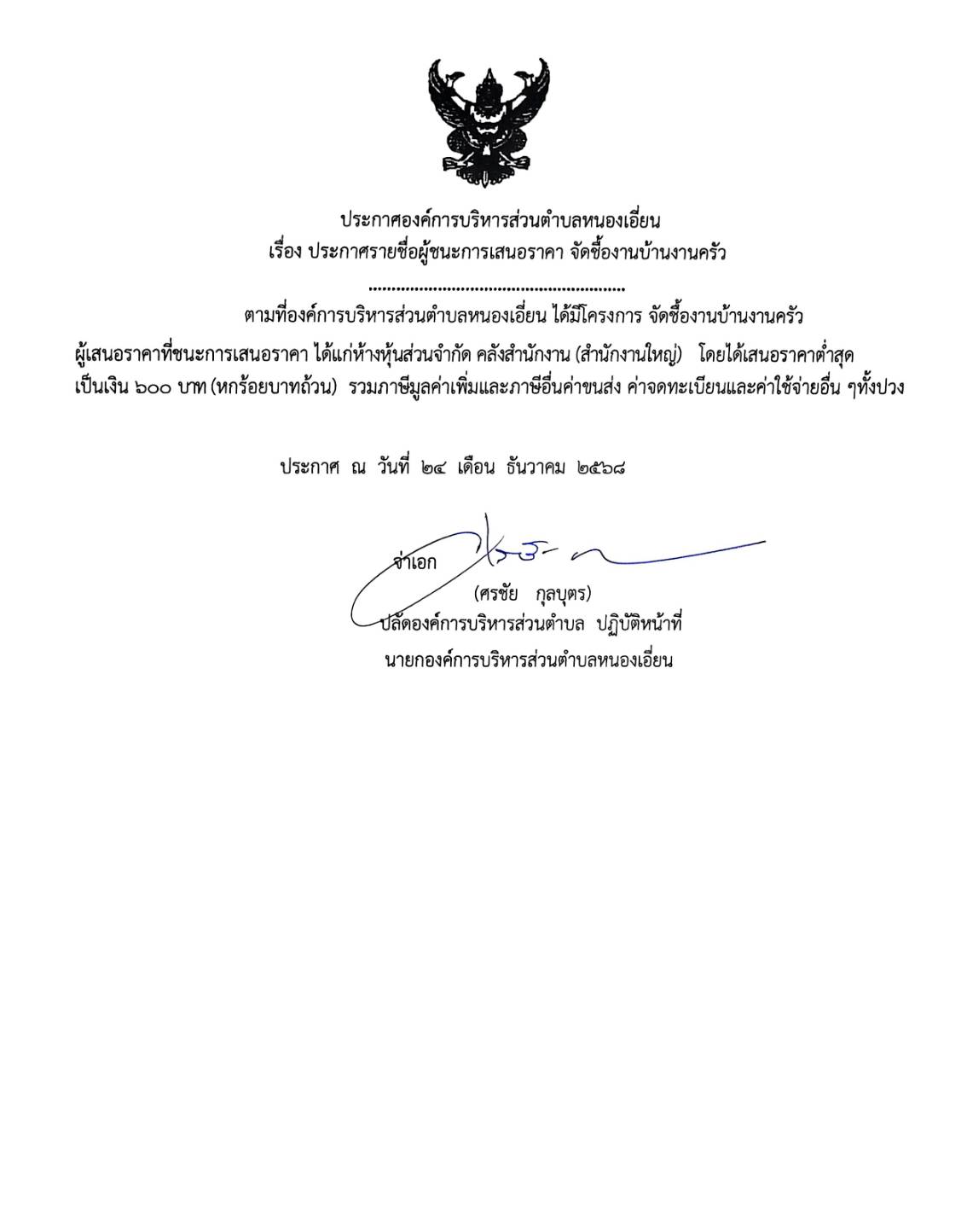 ประกาศรายชื่อผู้ชนะการเสนอราคา จัดชื้องานบ้านงานครัว สำนักปลัด
